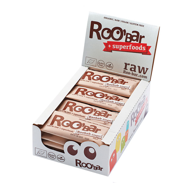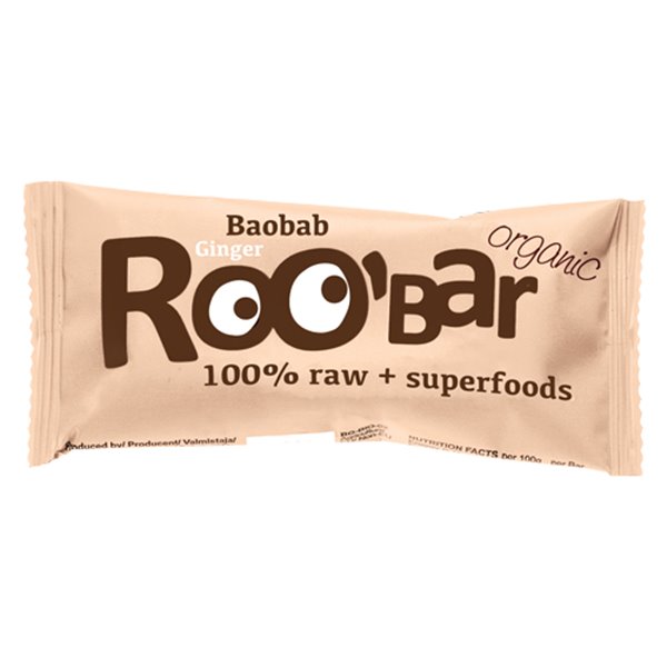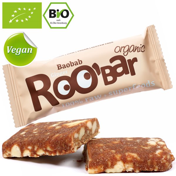 ROO’Bar's exotischer Rohkostriegel. Mit der Kraft des Affenbrotbaums (BAOBAB) und der feinen Note von Ingwer ist dieser Rohkostriegel von ROO'Bar ein echter, ehrlicher und absolut eigenständiger Superfood-Riegel!