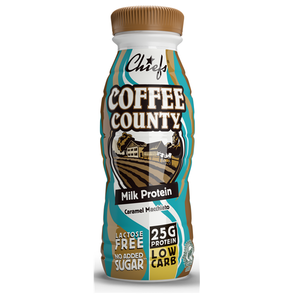 Chiefs Milk Potein - jetzt auch als eisgekühlter Caramel Macchiato. Der Geschmack des kräftigen Arabica-Kaffees mit einem Hauch von Karamell in cremiger Milch lässt dich perfekt in den tag starten.